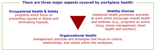 Workplace health is a comprehensive and integrated approach to health which focuses on the general population at a workplace and the organization as a whole. It addresses a broad range of health issues including physical and psychosocial, environment, health practices, personal resources, etc. through programs, policies and practices.