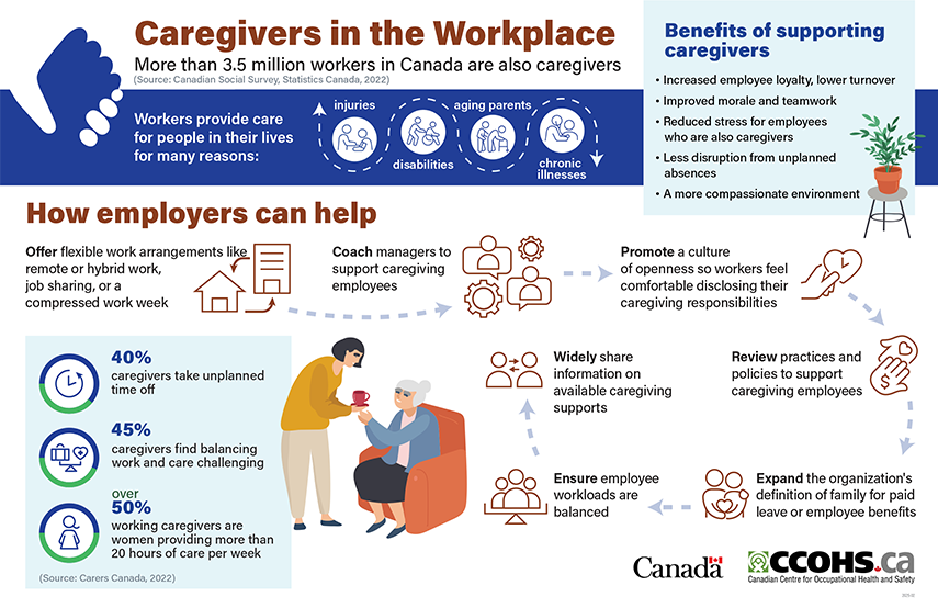 More than 3.5 million workers in Canada are also caregivers. Workers provide care for people in their lives for many reasons, such as injuries, disabilities, aging parents, and chronic illnesses.