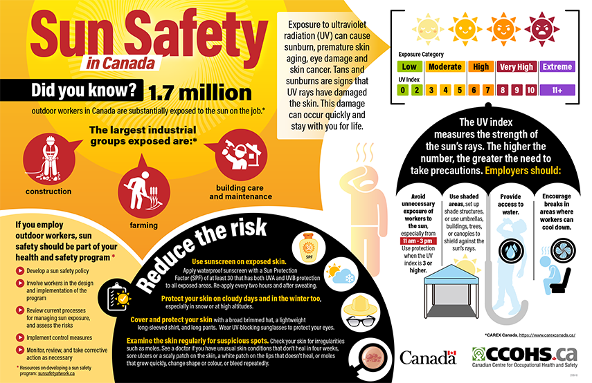 People who work outdoors are vulnerable to the sun's rays. Exposure to ultraviolet radiation (UV) can cause sunburn, premature skin aging, eye damage and skin cancer. Skin cancer is the most common cancer in Canada and the rate continues to rise, yet it is one of the most preventable.