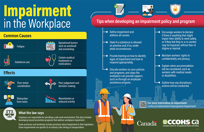 Because impairment is just like any other hazard that may affect the health and safety of workers, the employer must address impairment from all possible sources as part of their health and safety program. As a worker, it's important for you to be able to recognize the signs of impairment in yourself and others, and to learn about your organization's policies and procedures to help make sure that everyone is treated fairly and has a safe place to work.
