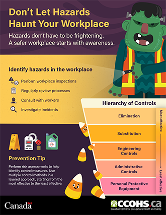 Reduce common workplace risks with practical prevention measures, including education and training, workplace inspections, and proper personal protective equipment. Always follow the hierarchy of controls to manage hazards and layer as many controls as needed to adequately protect from the hazard.
